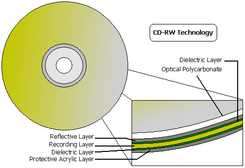 CD-RW gebruikt een technologie die fase-verandering wordt genoemd die pitts en grooves creëert door bepaalde delen van de recording-laag te veranderen zodat deze ofwel laserlicht absorberen of reflecteren. De dielectric laag is een insulatielaag die het fase verandering brandproces isoleert en snel afkoelt. Terwijl dit gebeurt verwarmt de CD-RW laser de polycrystalline oppervlakte van het fase-verandering brandprocess om de staat er van te veranderen (fase-verandering). De data wordt dus zonder reliefverandering opgenomen. Men heeft dus amorfe pitts en lands.